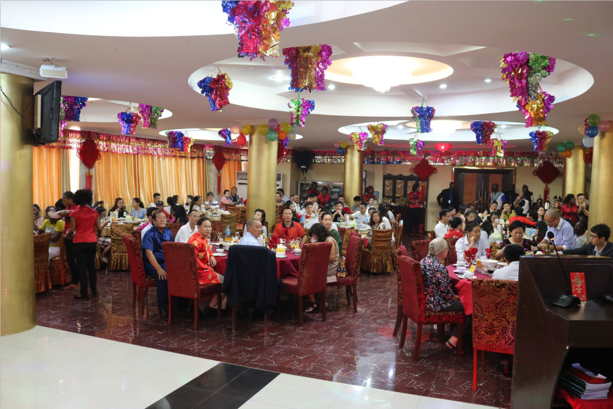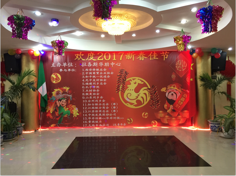 金鸡报晓,大地回春,除夕佳节,依然坚守在拉各斯的华人不再孤单,在拉各斯华助中心的组织下,一场热热闹闹的除夕团圆宴在中国商城饭店喜庆举办。