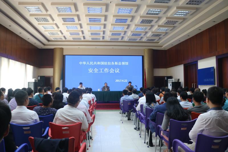4月22日上午,驻拉各斯总领馆召开了2017年一季度安全工作会议,中资企业、各行业协会负责人、安全联络员及侨团负责人近130人与会。