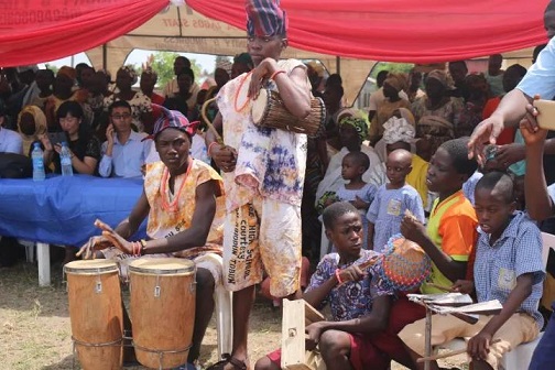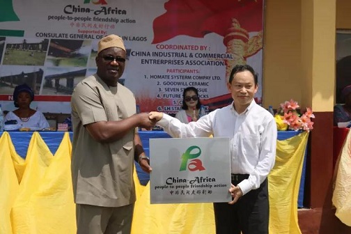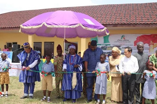 巢小良总领事、中国商贸企业协会会长倪孟晓、土皇OBA GANIYU ADEGBESAN, ONISE OF ISE LAND以及当地教育部门负责人共同为新落成的校舍剪彩