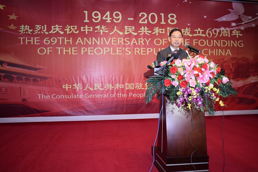 当地时间9月17日,中国驻拉各斯总领馆举行招待会,隆重庆祝中华人民共和国成立69周年。拉各斯州议会信息和战略委员会主席Olufunmilayo Tejuosho、驻拉各斯总领事巢小良夫妇、二大区警局局长Ibrahim Adamu、A大区移民局局长Mohammed Alhaji Alfa 、西非暨尼日利亚华侨华人联合总会会长董瑞萼、尼各界友人、侨团负责人和中资企业代表等出席了招待会。