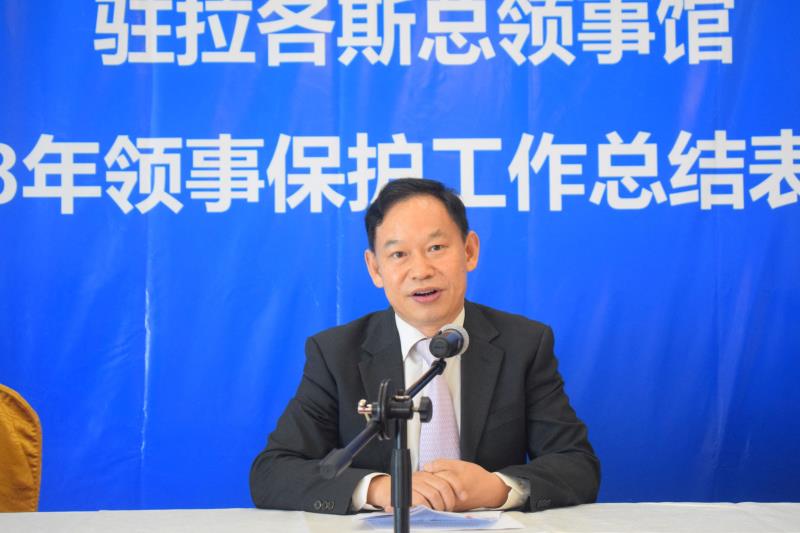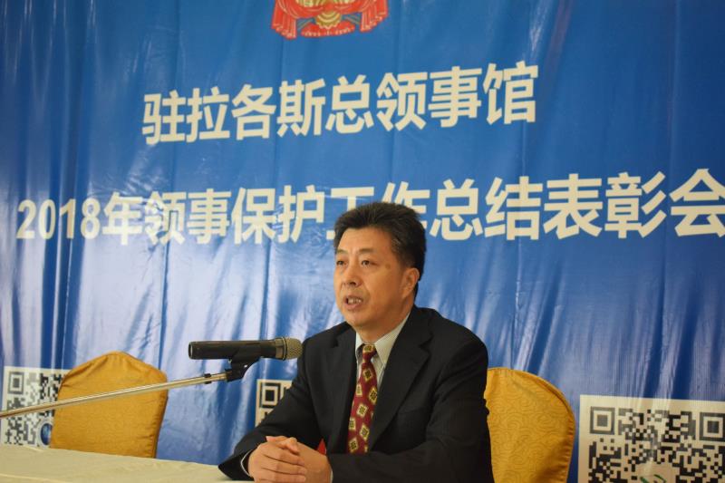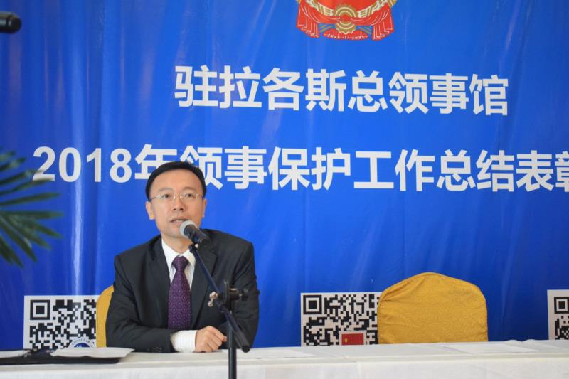 当地时间12月16日,驻拉各斯总领馆2018年领区领事保护工作总结表彰会议暨年终安全会议在拉各斯东方酒店顺利召开。驻拉各斯总领馆巢小良总领事、管仲奇副总领事、驻拉各斯总领馆经商室刘君胜参赞、孙锦伦主任、郑勇主任,西非暨尼日利亚华侨华人联合总会理事董凤池、华助中心主任孙国平、尼日利亚中国商贸企业协会会长及华星艺术团团长倪孟晓、尼日利亚福建同乡总会常务副会长林万美、尼日利亚江西联合商会会长汤力、尼日利亚台州商会名誉会长袁国昌、尼日利亚粤港澳同乡总会会长郑志坚、尼日利亚华商青年会会长陈涨漫、尼日利亚妇女联合总会会长周君、常务副会长黎英君、拉各斯中资企业协会会长边涛、莱基自贸区总经理黄习工、中海油总经理谢文胜及中资机构负责人和当地华文媒体等150余人参加会议。会议由管仲奇副总领事主持。